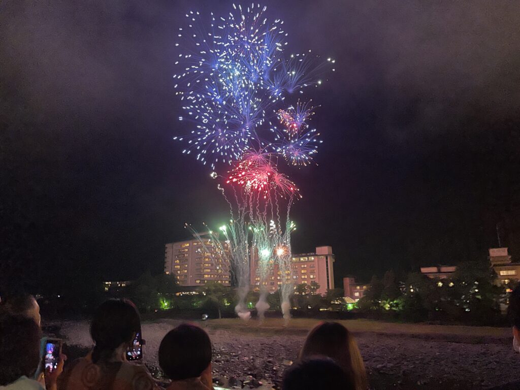 夜は花火が上がります。この時は6月だったので紫陽花イメージの花火だそう。